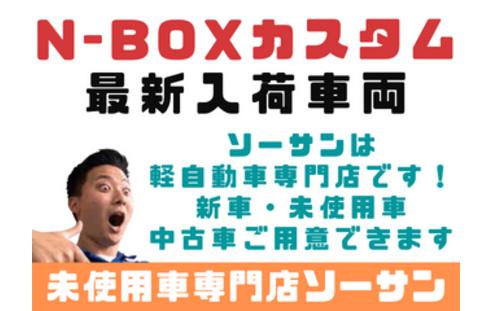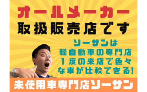 ソーサンは、埼玉県さいたま市・蕨市・戸田市・川口市・草加市・越谷市・八潮市・東京都足立区・北区を中心にご利用されている店舗です。年間販売台数1,000台突破!埼玉県の軽自動車(排気量660cc)中心としたトップ・クラスの販売店です!衝突軽減(アシスト)・低燃費・色や装備や状態などから検索いただき比較ができるお店です!購入後も自動車のことなら全てお任せ!車検や点検・鈑金修理などアフターサポート付きで地域トップクラスの充実店です!お客様の依頼・要望・必要に応じて現金・オートローンの月々支払(ローン分割、定額..等)方法をお選び頂けます!本体価格やナビ・オーディオなどの部分ローンなどご遠慮なく質問やご相談ください!