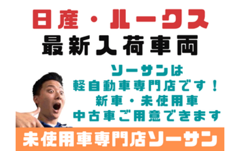 ソーサンは、埼玉県さいたま市・蕨市・戸田市・川口市・草加市・越谷市・八潮市・東京都足立区・北区を中心にご利用されている店舗です。年間販売台数1,000台突破!埼玉県の軽自動車(排気量660cc)中心としたトップ・クラスの販売店です!衝突軽減(アシスト)・低燃費・色や装備や状態などから検索いただき比較ができるお店です!購入後も自動車のことなら全てお任せ!車検や点検・鈑金修理などアフターサポート付きで地域トップクラスの充実店です!お客様の依頼・要望・必要に応じて現金・オートローンの月々支払(ローン分割、定額..等)方法をお選び頂けます!本体価格やナビ・オーディオなどの部分ローンなどご遠慮なく質問やご相談ください!